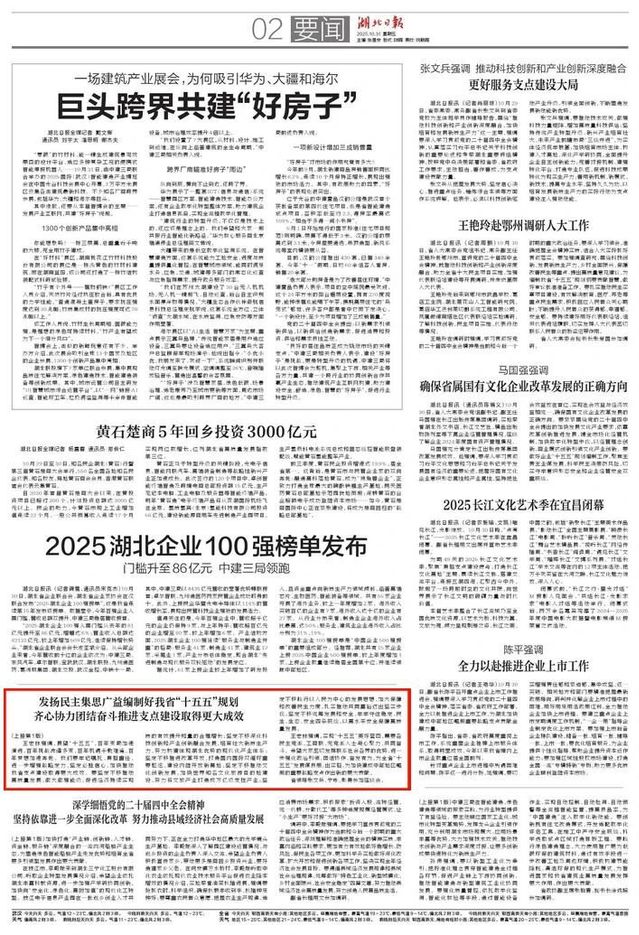 10月30日,中共湖北省委召开党外人士专题协商座谈会,深入学习贯彻习近平总书记在中共二十届四中全会上的重要讲话精神,就编制好我省“十五五”规划建议听取各民主党派省委会、省工商联负责人和无党派人士代表的意见建议。省委书记、省人大常委会主任、省“十五五”规划起草组组长王忠林主持会议并讲话。