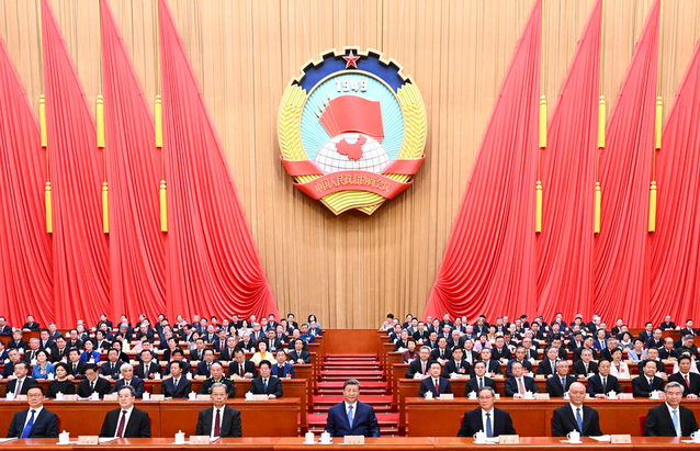 3月4日下午,中国人民政治协商会议第十四届全国委员会第四次会议在北京人民大会堂开幕。这是习近平、李强、赵乐际、蔡奇、丁薛祥、李希、韩正在主席台就座。新华社记者 燕雁 摄